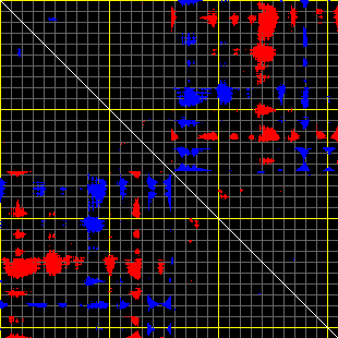 This matrix displays the maximum distance fluctuations between all pairs of CA atoms and between the two extreme conformations that were computed for this mode (DQMIN/DQMAX). Distance increases are plotted in blue and decreases in red for the strongest 10% of the residue pair distance changes. Every pixel corresponds to a single residue. Grey lines are drawn every 10 residues, yellow lines every 100 residues (counting from the upper left corner).