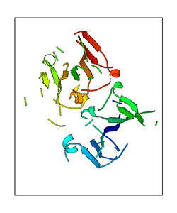 These views are prepared from three orthologuous viewpoints with MolScript. Secondary structures are determined from the C-alpha atom positions of your protein (N-terminal blue, C-terminal red).