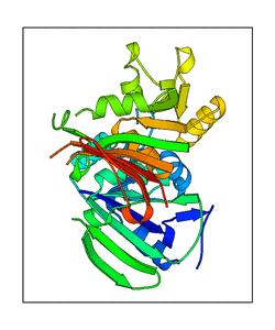 These views are prepared from three orthologuous viewpoints with MolScript. Secondary structures are determined from the C-alpha atom positions of your protein (N-terminal blue, C-terminal red).