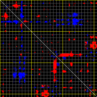 This matrix displays the maximum distance fluctuations between all pairs of CA atoms and between the two extreme conformations that were computed for this mode (DQMIN/DQMAX). Distance increases are plotted in blue and decreases in red for the strongest 10% of the residue pair distance changes. Every pixel corresponds to a single residue. Grey lines are drawn every 10 residues, yellow lines every 100 residues (counting from the upper left corner).