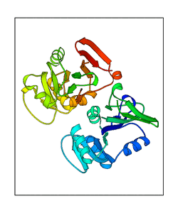 These views are prepared from three orthologuous viewpoints with MolScript. Secondary structures are determined from the C-alpha atom positions of your protein (N-terminal blue, C-terminal red).