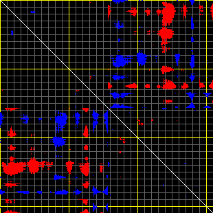 This matrix displays the maximum distance fluctuations between all pairs of CA atoms and between the two extreme conformations that were computed for this mode (DQMIN/DQMAX). Distance increases are plotted in blue and decreases in red for the strongest 10% of the residue pair distance changes. Every pixel corresponds to a single residue. Grey lines are drawn every 10 residues, yellow lines every 100 residues (counting from the upper left corner).