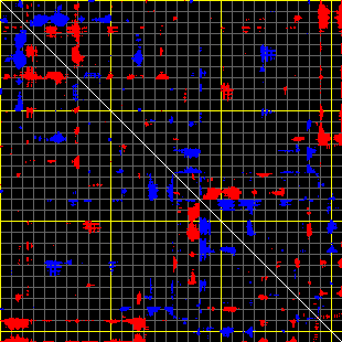 This matrix displays the maximum distance fluctuations between all pairs of CA atoms and between the two extreme conformations that were computed for this mode (DQMIN/DQMAX). Distance increases are plotted in blue and decreases in red for the strongest 10% of the residue pair distance changes. Every pixel corresponds to a single residue. Grey lines are drawn every 10 residues, yellow lines every 100 residues (counting from the upper left corner).