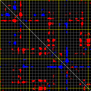 This matrix displays the maximum distance fluctuations between all pairs of CA atoms and between the two extreme conformations that were computed for this mode (DQMIN/DQMAX). Distance increases are plotted in blue and decreases in red for the strongest 10% of the residue pair distance changes. Every pixel corresponds to a single residue. Grey lines are drawn every 10 residues, yellow lines every 100 residues (counting from the upper left corner).