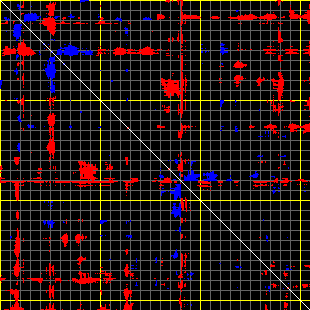 This matrix displays the maximum distance fluctuations between all pairs of CA atoms and between the two extreme conformations that were computed for this mode (DQMIN/DQMAX). Distance increases are plotted in blue and decreases in red for the strongest 10% of the residue pair distance changes. Every pixel corresponds to a single residue. Grey lines are drawn every 10 residues, yellow lines every 100 residues (counting from the upper left corner).