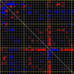 This matrix displays the maximum distance fluctuations between all pairs of CA atoms and between the two extreme conformations that were computed for this mode (DQMIN/DQMAX). Distance increases are plotted in blue and decreases in red for the strongest 10% of the residue pair distance changes. Every pixel corresponds to a single residue. Grey lines are drawn every 10 residues, yellow lines every 100 residues (counting from the upper left corner).