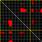 This matrix displays the maximum distance fluctuations between all pairs of CA atoms and between the two extreme conformations that were computed for this mode (DQMIN/DQMAX). Distance increases are plotted in blue and decreases in red for the strongest 10% of the residue pair distance changes. Every pixel corresponds to a single residue. Grey lines are drawn every 10 residues, yellow lines every 100 residues (counting from the upper left corner).