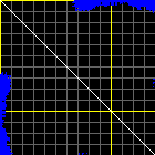 This matrix displays the maximum distance fluctuations between all pairs of CA atoms and between the two extreme conformations that were computed for this mode (DQMIN/DQMAX). Distance increases are plotted in blue and decreases in red for the strongest 10% of the residue pair distance changes. Every pixel corresponds to a single residue. Grey lines are drawn every 10 residues, yellow lines every 100 residues (counting from the upper left corner).