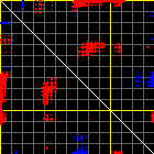This matrix displays the maximum distance fluctuations between all pairs of CA atoms and between the two extreme conformations that were computed for this mode (DQMIN/DQMAX). Distance increases are plotted in blue and decreases in red for the strongest 10% of the residue pair distance changes. Every pixel corresponds to a single residue. Grey lines are drawn every 10 residues, yellow lines every 100 residues (counting from the upper left corner).