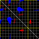 This matrix displays the maximum distance fluctuations between all pairs of CA atoms and between the two extreme conformations that were computed for this mode (DQMIN/DQMAX). Distance increases are plotted in blue and decreases in red for the strongest 10% of the residue pair distance changes. Every pixel corresponds to a single residue. Grey lines are drawn every 10 residues, yellow lines every 100 residues (counting from the upper left corner).