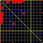 This matrix displays the maximum distance fluctuations between all pairs of CA atoms and between the two extreme conformations that were computed for this mode (DQMIN/DQMAX). Distance increases are plotted in blue and decreases in red for the strongest 10% of the residue pair distance changes. Every pixel corresponds to a single residue. Grey lines are drawn every 10 residues, yellow lines every 100 residues (counting from the upper left corner).