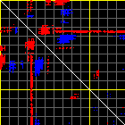 This matrix displays the maximum distance fluctuations between all pairs of CA atoms and between the two extreme conformations that were computed for this mode (DQMIN/DQMAX). Distance increases are plotted in blue and decreases in red for the strongest 10% of the residue pair distance changes. Every pixel corresponds to a single residue. Grey lines are drawn every 10 residues, yellow lines every 100 residues (counting from the upper left corner).