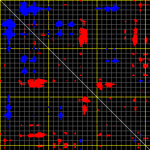 This matrix displays the maximum distance fluctuations between all pairs of CA atoms and between the two extreme conformations that were computed for this mode (DQMIN/DQMAX). Distance increases are plotted in blue and decreases in red for the strongest 10% of the residue pair distance changes. Every pixel corresponds to a single residue. Grey lines are drawn every 10 residues, yellow lines every 100 residues (counting from the upper left corner).
