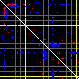 This matrix displays the maximum distance fluctuations between all pairs of CA atoms and between the two extreme conformations that were computed for this mode (DQMIN/DQMAX). Distance increases are plotted in blue and decreases in red for the strongest 10% of the residue pair distance changes. Every pixel corresponds to a single residue. Grey lines are drawn every 10 residues, yellow lines every 100 residues (counting from the upper left corner).