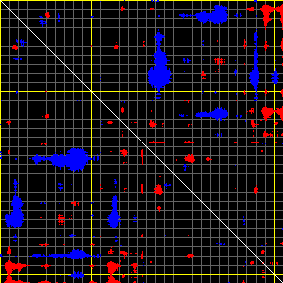 This matrix displays the maximum distance fluctuations between all pairs of CA atoms and between the two extreme conformations that were computed for this mode (DQMIN/DQMAX). Distance increases are plotted in blue and decreases in red for the strongest 10% of the residue pair distance changes. Every pixel corresponds to a single residue. Grey lines are drawn every 10 residues, yellow lines every 100 residues (counting from the upper left corner).