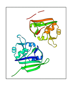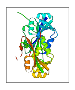 These views are prepared from three orthologuous viewpoints with MolScript. Secondary structures are determined from the C-alpha atom positions of your protein (N-terminal blue, C-terminal red).