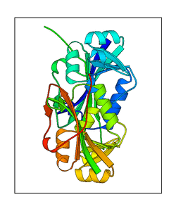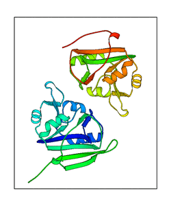 These views are prepared from three orthologuous viewpoints with MolScript. Secondary structures are determined from the C-alpha atom positions of your protein (N-terminal blue, C-terminal red).