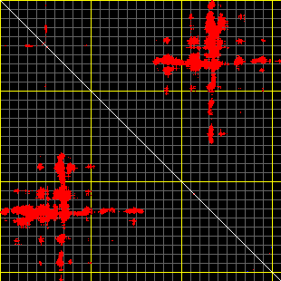 This matrix displays the maximum distance fluctuations between all pairs of CA atoms and between the two extreme conformations that were computed for this mode (DQMIN/DQMAX). Distance increases are plotted in blue and decreases in red for the strongest 10% of the residue pair distance changes. Every pixel corresponds to a single residue. Grey lines are drawn every 10 residues, yellow lines every 100 residues (counting from the upper left corner).