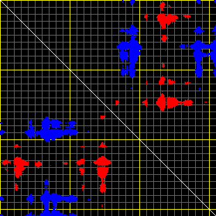 This matrix displays the maximum distance fluctuations between all pairs of CA atoms and between the two extreme conformations that were computed for this mode (DQMIN/DQMAX). Distance increases are plotted in blue and decreases in red for the strongest 10% of the residue pair distance changes. Every pixel corresponds to a single residue. Grey lines are drawn every 10 residues, yellow lines every 100 residues (counting from the upper left corner).