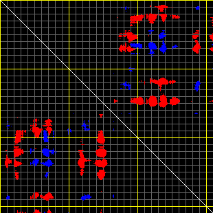 This matrix displays the maximum distance fluctuations between all pairs of CA atoms and between the two extreme conformations that were computed for this mode (DQMIN/DQMAX). Distance increases are plotted in blue and decreases in red for the strongest 10% of the residue pair distance changes. Every pixel corresponds to a single residue. Grey lines are drawn every 10 residues, yellow lines every 100 residues (counting from the upper left corner).
