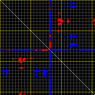 This matrix displays the maximum distance fluctuations between all pairs of CA atoms and between the two extreme conformations that were computed for this mode (DQMIN/DQMAX). Distance increases are plotted in blue and decreases in red for the strongest 10% of the residue pair distance changes. Every pixel corresponds to a single residue. Grey lines are drawn every 10 residues, yellow lines every 100 residues (counting from the upper left corner).