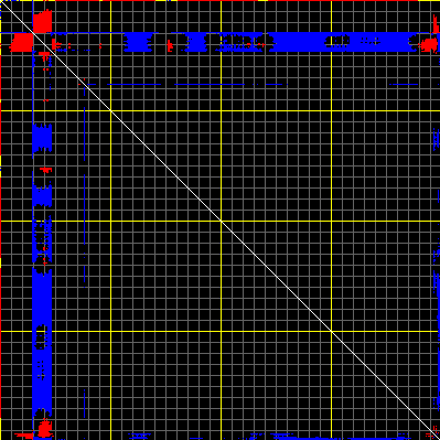 This matrix displays the maximum distance fluctuations between all pairs of CA atoms and between the two extreme conformations that were computed for this mode (DQMIN/DQMAX). Distance increases are plotted in blue and decreases in red for the strongest 10% of the residue pair distance changes. Every pixel corresponds to a single residue. Grey lines are drawn every 10 residues, yellow lines every 100 residues (counting from the upper left corner).