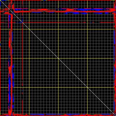 This matrix displays the maximum distance fluctuations between all pairs of CA atoms and between the two extreme conformations that were computed for this mode (DQMIN/DQMAX). Distance increases are plotted in blue and decreases in red for the strongest 10% of the residue pair distance changes. Every pixel corresponds to a single residue. Grey lines are drawn every 10 residues, yellow lines every 100 residues (counting from the upper left corner).
