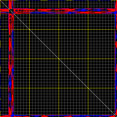 This matrix displays the maximum distance fluctuations between all pairs of CA atoms and between the two extreme conformations that were computed for this mode (DQMIN/DQMAX). Distance increases are plotted in blue and decreases in red for the strongest 10% of the residue pair distance changes. Every pixel corresponds to a single residue. Grey lines are drawn every 10 residues, yellow lines every 100 residues (counting from the upper left corner).