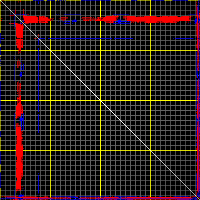 This matrix displays the maximum distance fluctuations between all pairs of CA atoms and between the two extreme conformations that were computed for this mode (DQMIN/DQMAX). Distance increases are plotted in blue and decreases in red for the strongest 10% of the residue pair distance changes. Every pixel corresponds to a single residue. Grey lines are drawn every 10 residues, yellow lines every 100 residues (counting from the upper left corner).