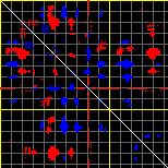 This matrix displays the maximum distance fluctuations between all pairs of CA atoms and between the two extreme conformations that were computed for this mode (DQMIN/DQMAX). Distance increases are plotted in blue and decreases in red for the strongest 10% of the residue pair distance changes. Every pixel corresponds to a single residue. Grey lines are drawn every 10 residues, yellow lines every 100 residues (counting from the upper left corner).