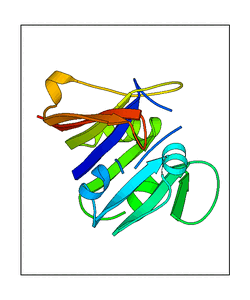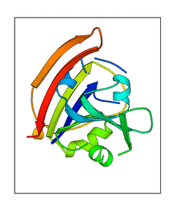 These views are prepared from three orthologuous viewpoints with MolScript. Secondary structures are determined from the C-alpha atom positions of your protein (N-terminal blue, C-terminal red).