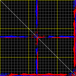 This matrix displays the maximum distance fluctuations between all pairs of CA atoms and between the two extreme conformations that were computed for this mode (DQMIN/DQMAX). Distance increases are plotted in blue and decreases in red for the strongest 10% of the residue pair distance changes. Every pixel corresponds to a single residue. Grey lines are drawn every 10 residues, yellow lines every 100 residues (counting from the upper left corner).