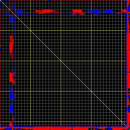 This matrix displays the maximum distance fluctuations between all pairs of CA atoms and between the two extreme conformations that were computed for this mode (DQMIN/DQMAX). Distance increases are plotted in blue and decreases in red for the strongest 10% of the residue pair distance changes. Every pixel corresponds to a single residue. Grey lines are drawn every 10 residues, yellow lines every 100 residues (counting from the upper left corner).