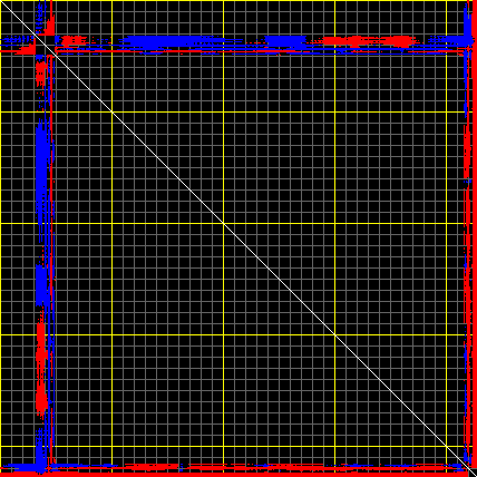 This matrix displays the maximum distance fluctuations between all pairs of CA atoms and between the two extreme conformations that were computed for this mode (DQMIN/DQMAX). Distance increases are plotted in blue and decreases in red for the strongest 10% of the residue pair distance changes. Every pixel corresponds to a single residue. Grey lines are drawn every 10 residues, yellow lines every 100 residues (counting from the upper left corner).