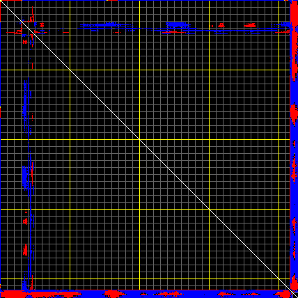 This matrix displays the maximum distance fluctuations between all pairs of CA atoms and between the two extreme conformations that were computed for this mode (DQMIN/DQMAX). Distance increases are plotted in blue and decreases in red for the strongest 10% of the residue pair distance changes. Every pixel corresponds to a single residue. Grey lines are drawn every 10 residues, yellow lines every 100 residues (counting from the upper left corner).
