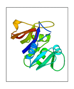These views are prepared from three orthologuous viewpoints with MolScript. Secondary structures are determined from the C-alpha atom positions of your protein (N-terminal blue, C-terminal red).
