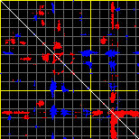 This matrix displays the maximum distance fluctuations between all pairs of CA atoms and between the two extreme conformations that were computed for this mode (DQMIN/DQMAX). Distance increases are plotted in blue and decreases in red for the strongest 10% of the residue pair distance changes. Every pixel corresponds to a single residue. Grey lines are drawn every 10 residues, yellow lines every 100 residues (counting from the upper left corner).