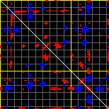 This matrix displays the maximum distance fluctuations between all pairs of CA atoms and between the two extreme conformations that were computed for this mode (DQMIN/DQMAX). Distance increases are plotted in blue and decreases in red for the strongest 10% of the residue pair distance changes. Every pixel corresponds to a single residue. Grey lines are drawn every 10 residues, yellow lines every 100 residues (counting from the upper left corner).