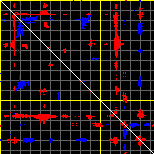 This matrix displays the maximum distance fluctuations between all pairs of CA atoms and between the two extreme conformations that were computed for this mode (DQMIN/DQMAX). Distance increases are plotted in blue and decreases in red for the strongest 10% of the residue pair distance changes. Every pixel corresponds to a single residue. Grey lines are drawn every 10 residues, yellow lines every 100 residues (counting from the upper left corner).
