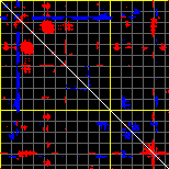 This matrix displays the maximum distance fluctuations between all pairs of CA atoms and between the two extreme conformations that were computed for this mode (DQMIN/DQMAX). Distance increases are plotted in blue and decreases in red for the strongest 10% of the residue pair distance changes. Every pixel corresponds to a single residue. Grey lines are drawn every 10 residues, yellow lines every 100 residues (counting from the upper left corner).