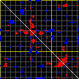 This matrix displays the maximum distance fluctuations between all pairs of CA atoms and between the two extreme conformations that were computed for this mode (DQMIN/DQMAX). Distance increases are plotted in blue and decreases in red for the strongest 10% of the residue pair distance changes. Every pixel corresponds to a single residue. Grey lines are drawn every 10 residues, yellow lines every 100 residues (counting from the upper left corner).