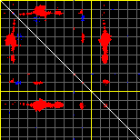 This matrix displays the maximum distance fluctuations between all pairs of CA atoms and between the two extreme conformations that were computed for this mode (DQMIN/DQMAX). Distance increases are plotted in blue and decreases in red for the strongest 10% of the residue pair distance changes. Every pixel corresponds to a single residue. Grey lines are drawn every 10 residues, yellow lines every 100 residues (counting from the upper left corner).