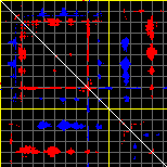 This matrix displays the maximum distance fluctuations between all pairs of CA atoms and between the two extreme conformations that were computed for this mode (DQMIN/DQMAX). Distance increases are plotted in blue and decreases in red for the strongest 10% of the residue pair distance changes. Every pixel corresponds to a single residue. Grey lines are drawn every 10 residues, yellow lines every 100 residues (counting from the upper left corner).