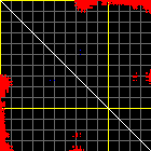 This matrix displays the maximum distance fluctuations between all pairs of CA atoms and between the two extreme conformations that were computed for this mode (DQMIN/DQMAX). Distance increases are plotted in blue and decreases in red for the strongest 10% of the residue pair distance changes. Every pixel corresponds to a single residue. Grey lines are drawn every 10 residues, yellow lines every 100 residues (counting from the upper left corner).