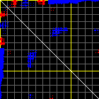 This matrix displays the maximum distance fluctuations between all pairs of CA atoms and between the two extreme conformations that were computed for this mode (DQMIN/DQMAX). Distance increases are plotted in blue and decreases in red for the strongest 10% of the residue pair distance changes. Every pixel corresponds to a single residue. Grey lines are drawn every 10 residues, yellow lines every 100 residues (counting from the upper left corner).