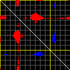 This matrix displays the maximum distance fluctuations between all pairs of CA atoms and between the two extreme conformations that were computed for this mode (DQMIN/DQMAX). Distance increases are plotted in blue and decreases in red for the strongest 10% of the residue pair distance changes. Every pixel corresponds to a single residue. Grey lines are drawn every 10 residues, yellow lines every 100 residues (counting from the upper left corner).