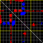 This matrix displays the maximum distance fluctuations between all pairs of CA atoms and between the two extreme conformations that were computed for this mode (DQMIN/DQMAX). Distance increases are plotted in blue and decreases in red for the strongest 10% of the residue pair distance changes. Every pixel corresponds to a single residue. Grey lines are drawn every 10 residues, yellow lines every 100 residues (counting from the upper left corner).