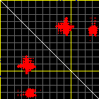This matrix displays the maximum distance fluctuations between all pairs of CA atoms and between the two extreme conformations that were computed for this mode (DQMIN/DQMAX). Distance increases are plotted in blue and decreases in red for the strongest 10% of the residue pair distance changes. Every pixel corresponds to a single residue. Grey lines are drawn every 10 residues, yellow lines every 100 residues (counting from the upper left corner).