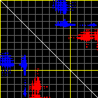 This matrix displays the maximum distance fluctuations between all pairs of CA atoms and between the two extreme conformations that were computed for this mode (DQMIN/DQMAX). Distance increases are plotted in blue and decreases in red for the strongest 10% of the residue pair distance changes. Every pixel corresponds to a single residue. Grey lines are drawn every 10 residues, yellow lines every 100 residues (counting from the upper left corner).