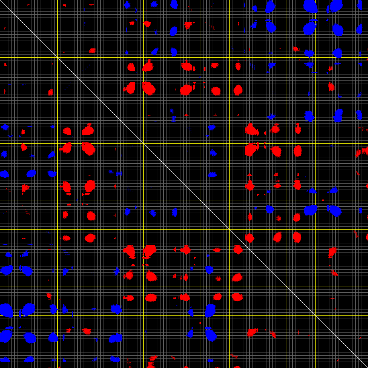 This matrix displays the maximum distance fluctuations between all pairs of CA atoms and between the two extreme conformations that were computed for this mode (DQMIN/DQMAX). Distance increases are plotted in blue and decreases in red for the strongest 10% of the residue pair distance changes. Every pixel corresponds to a single residue. Grey lines are drawn every 10 residues, yellow lines every 100 residues (counting from the upper left corner).